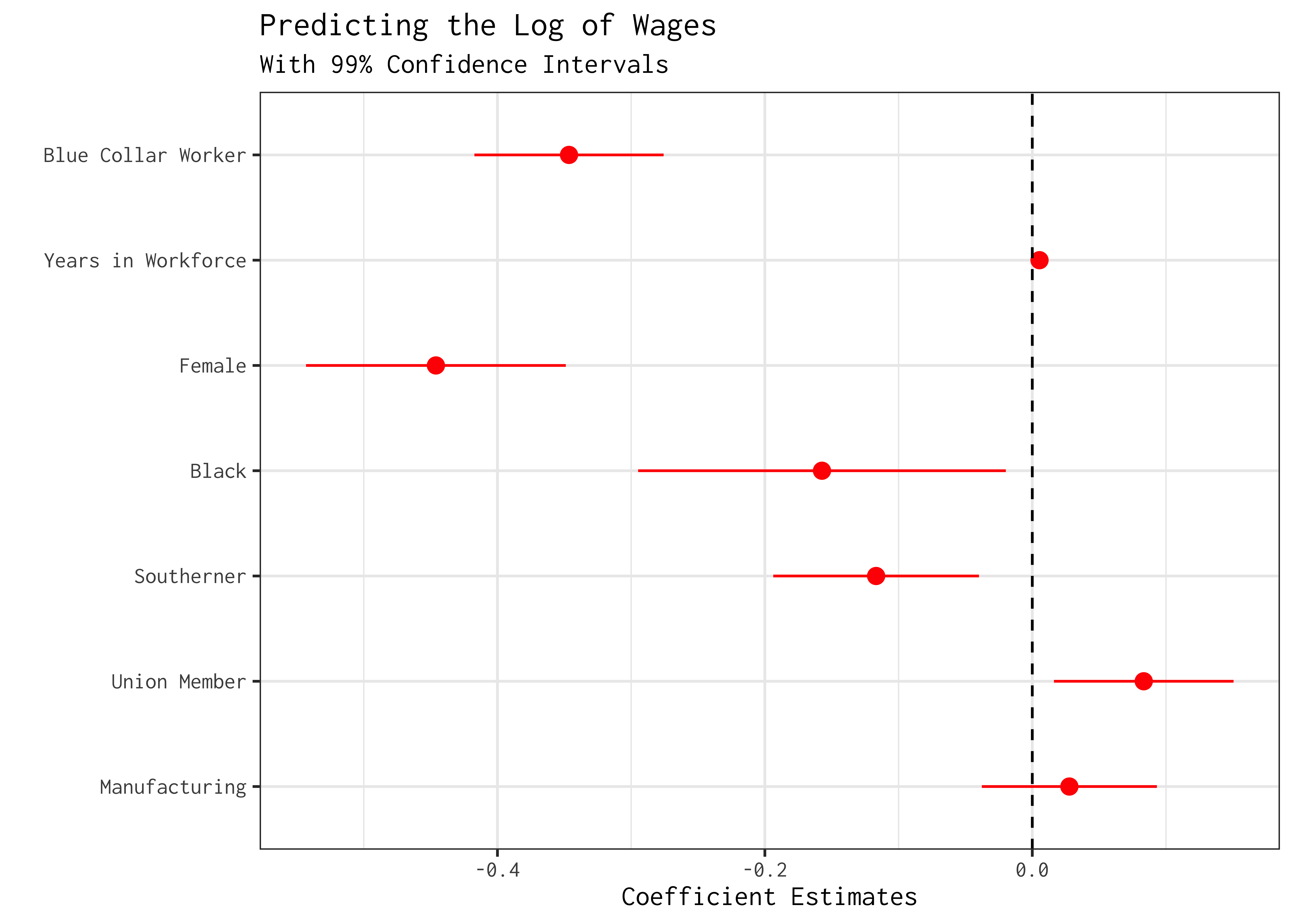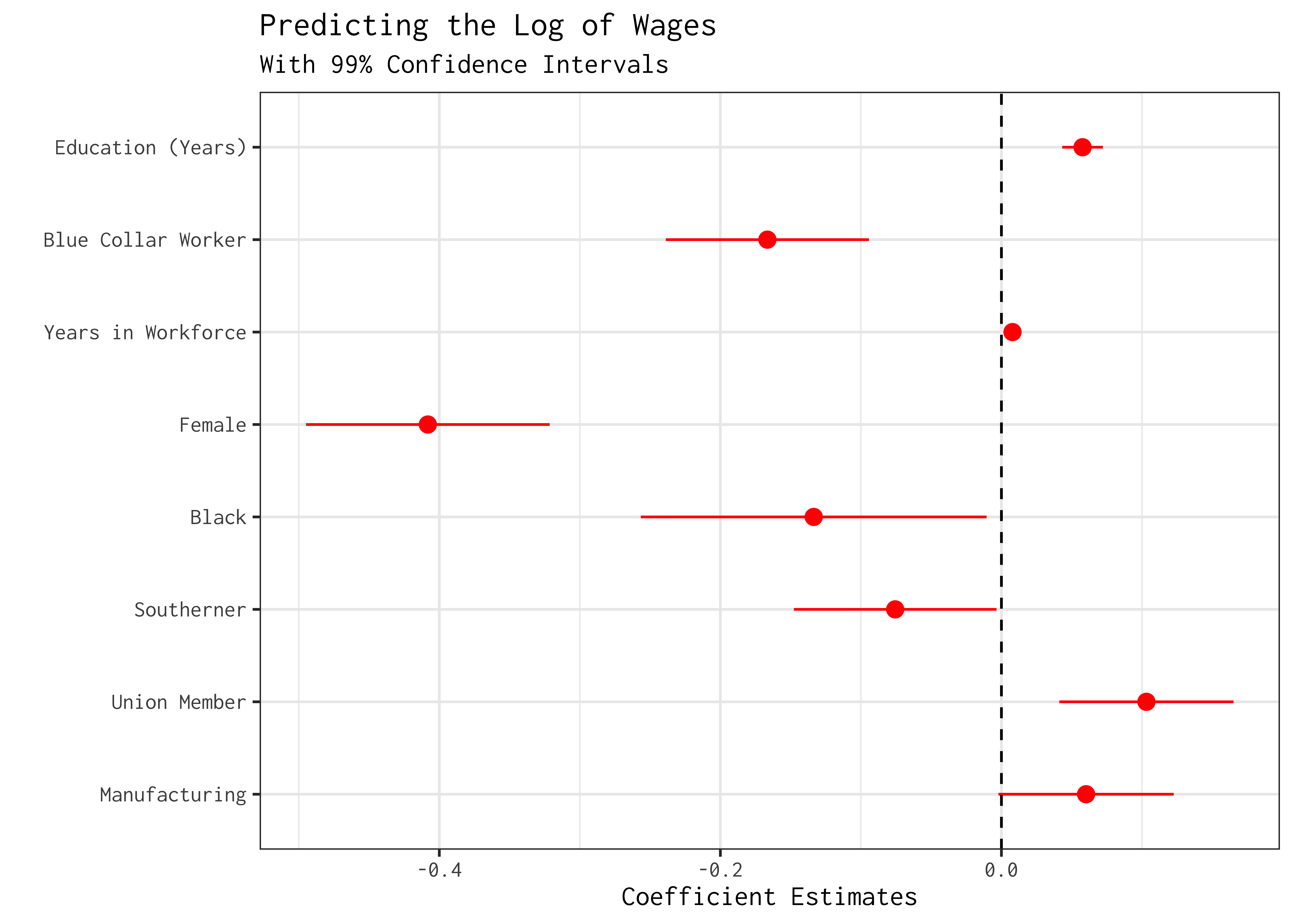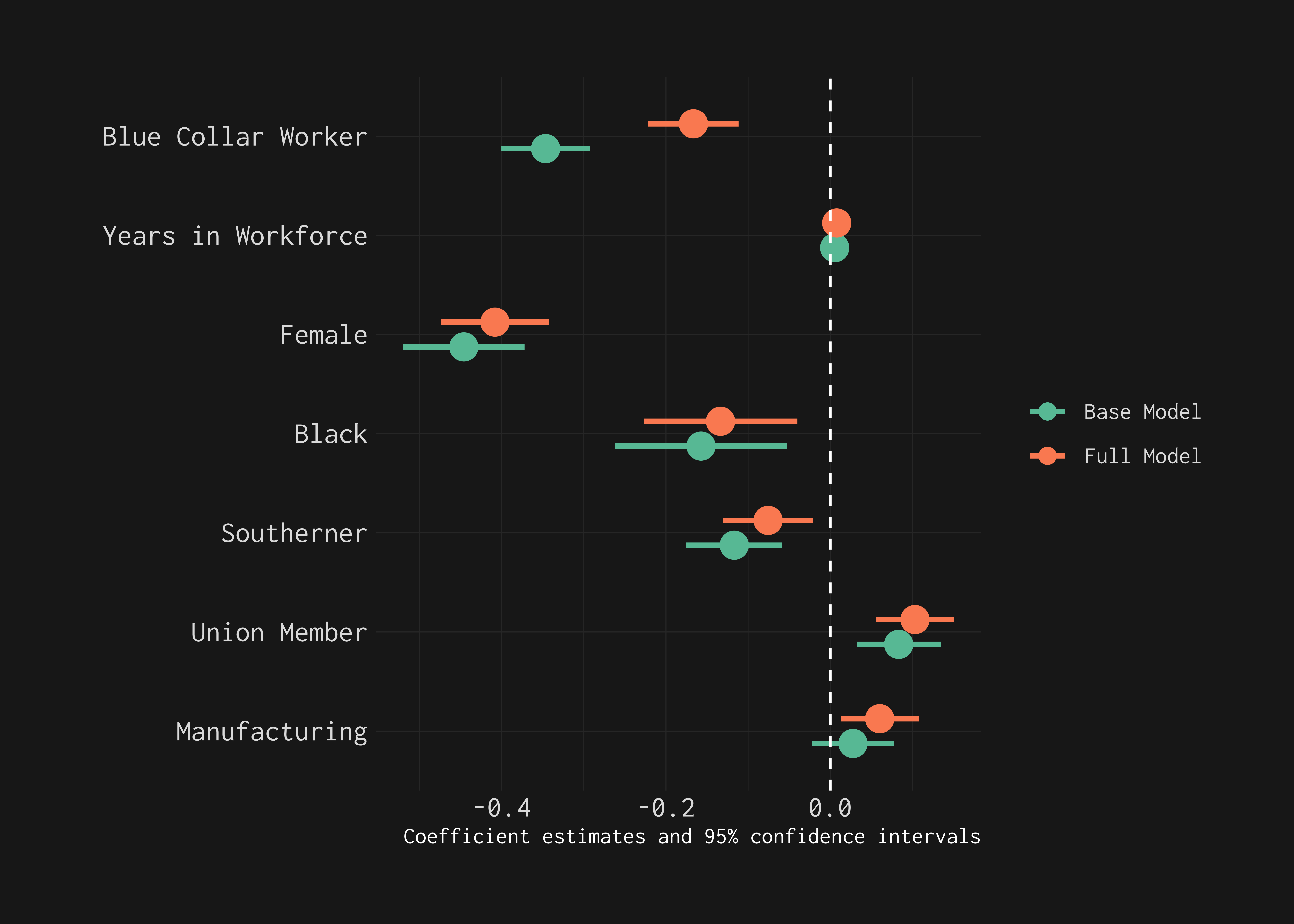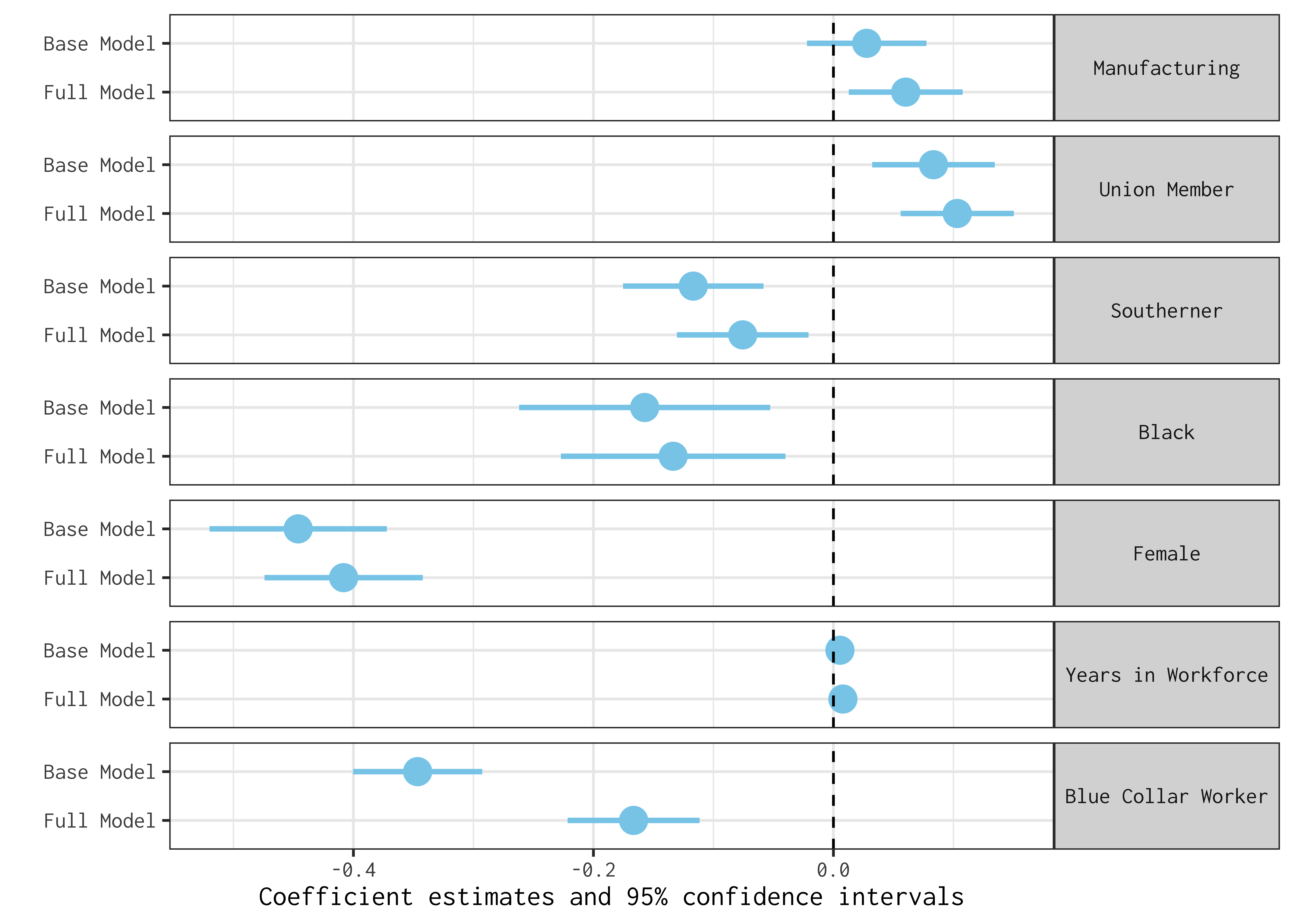 To demonstrate the utility of modelplot(), let’s fit a model that’s a bit more complex. To do so, we’ll use the wage_panelr dataset as well as the lm_robust() function from estimatr. For some context, here’s a summary of wage_panelr:
