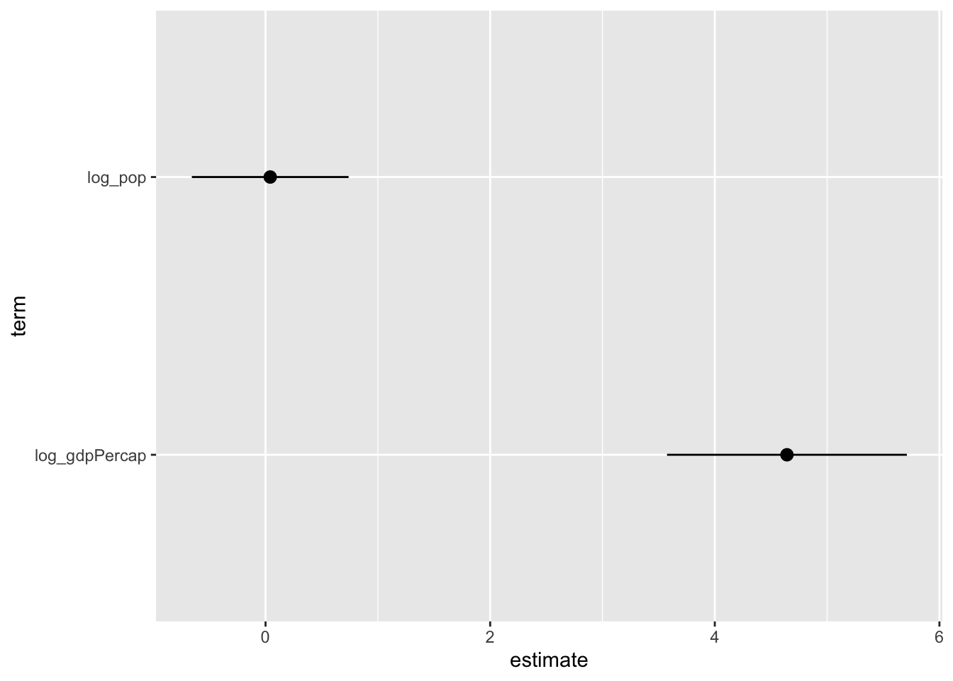 Using the gapminder_2007 data frame, let’s regress life expectancy on the following predictors: log_pop, continent and log_gdpPercap.