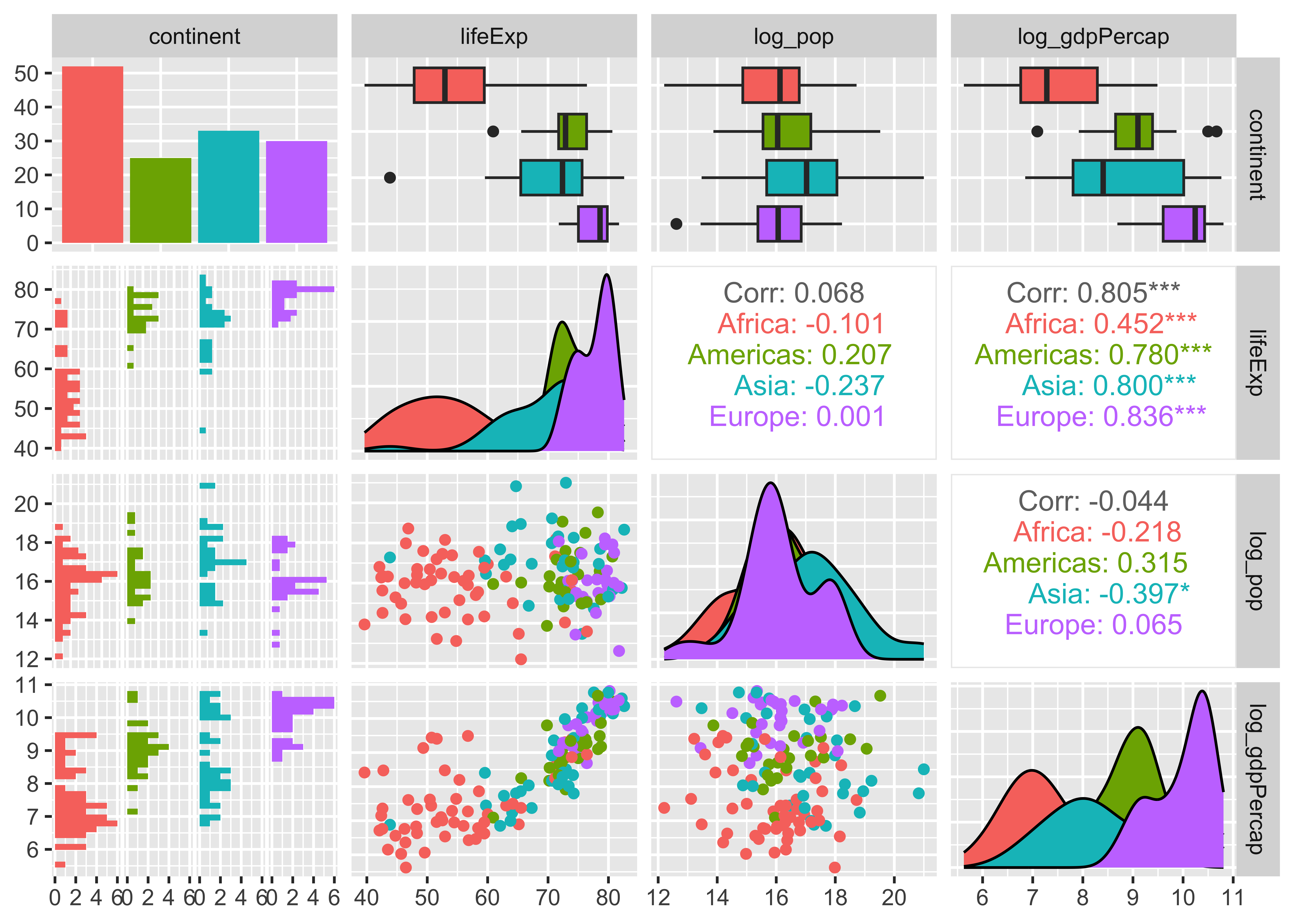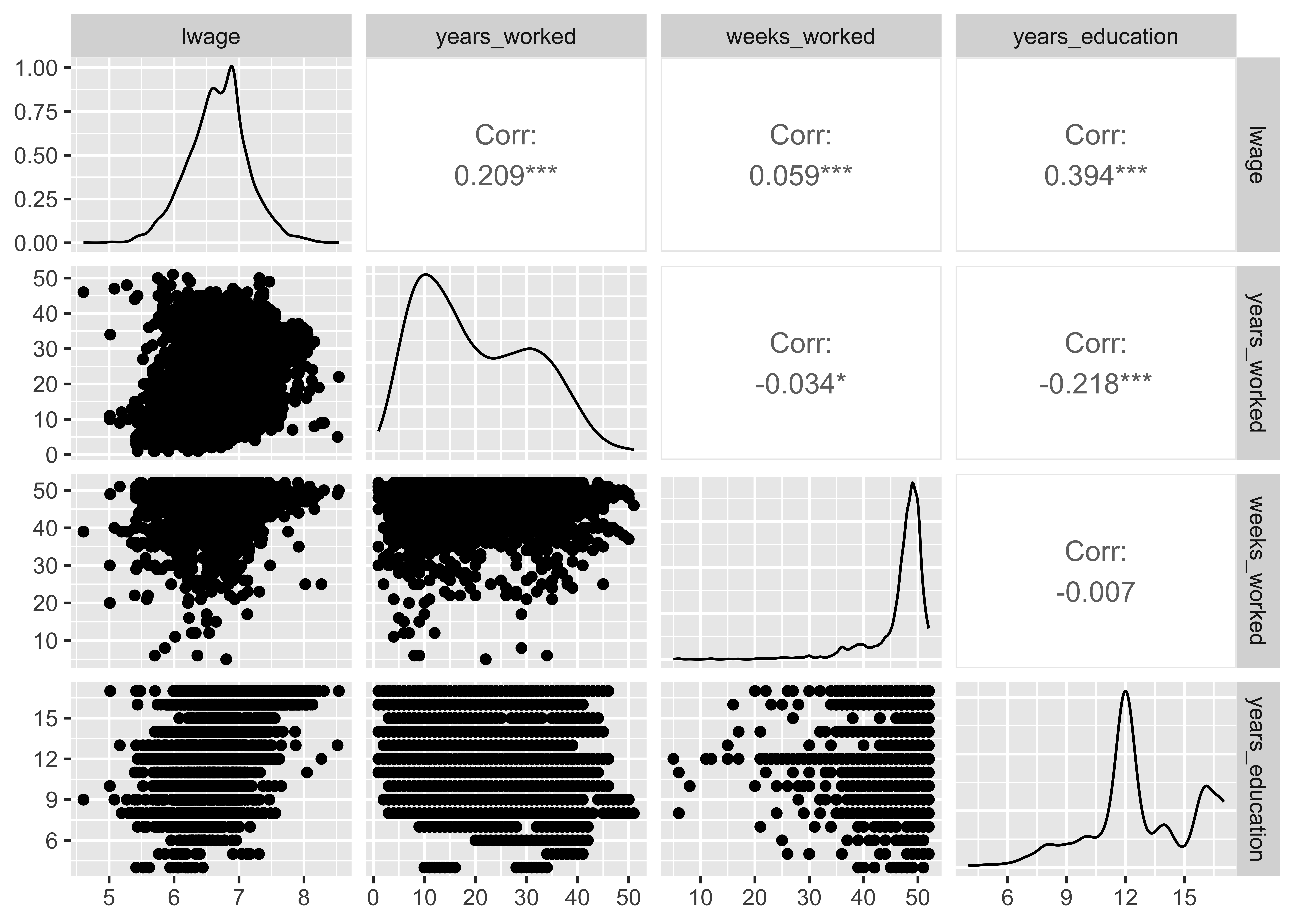 We’ve already seen how skimr and summarytools can help us explore our data. Here’s another helpful library—i.e., GGally—that we can use to illuminate relationships among variables in our input data.