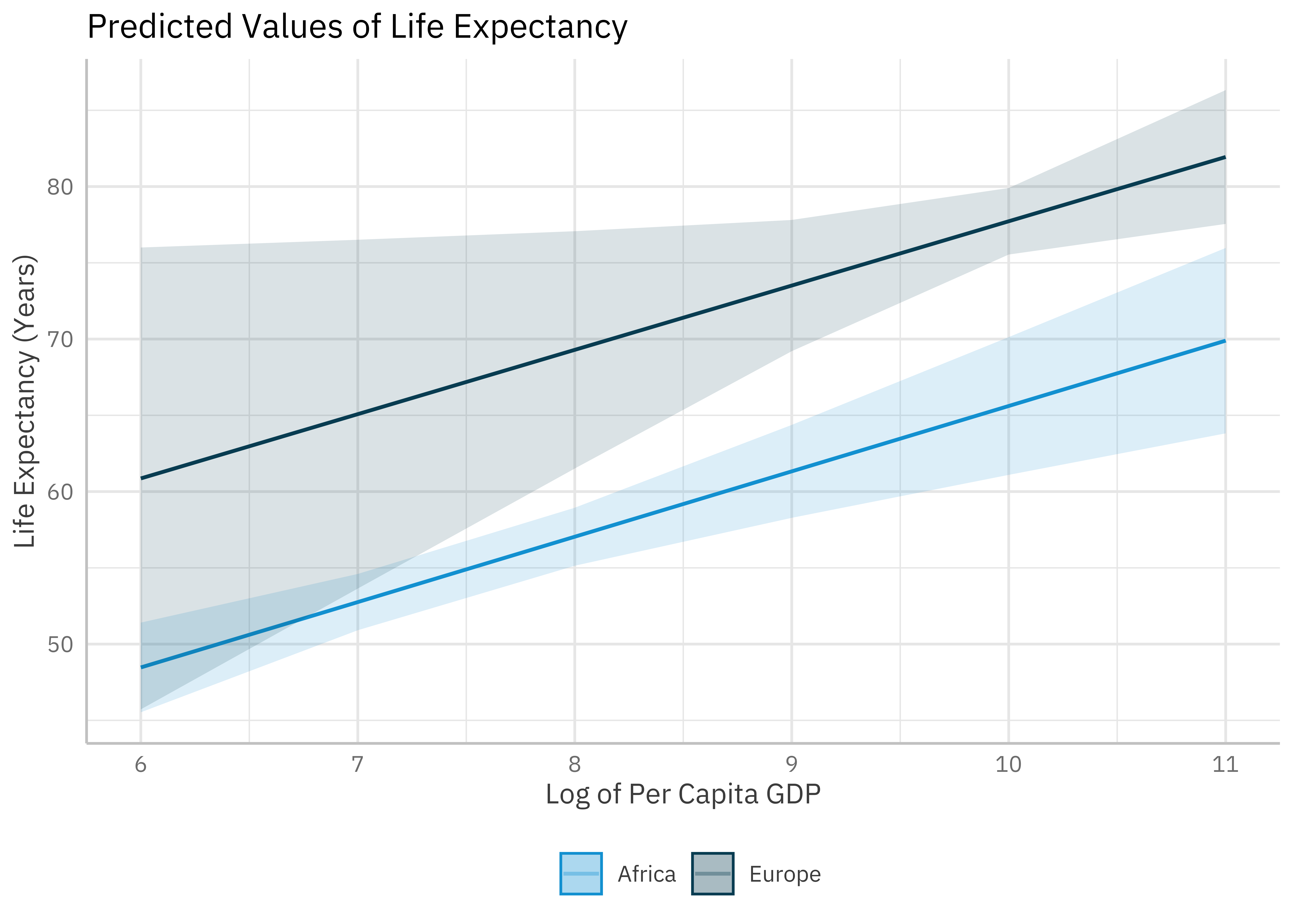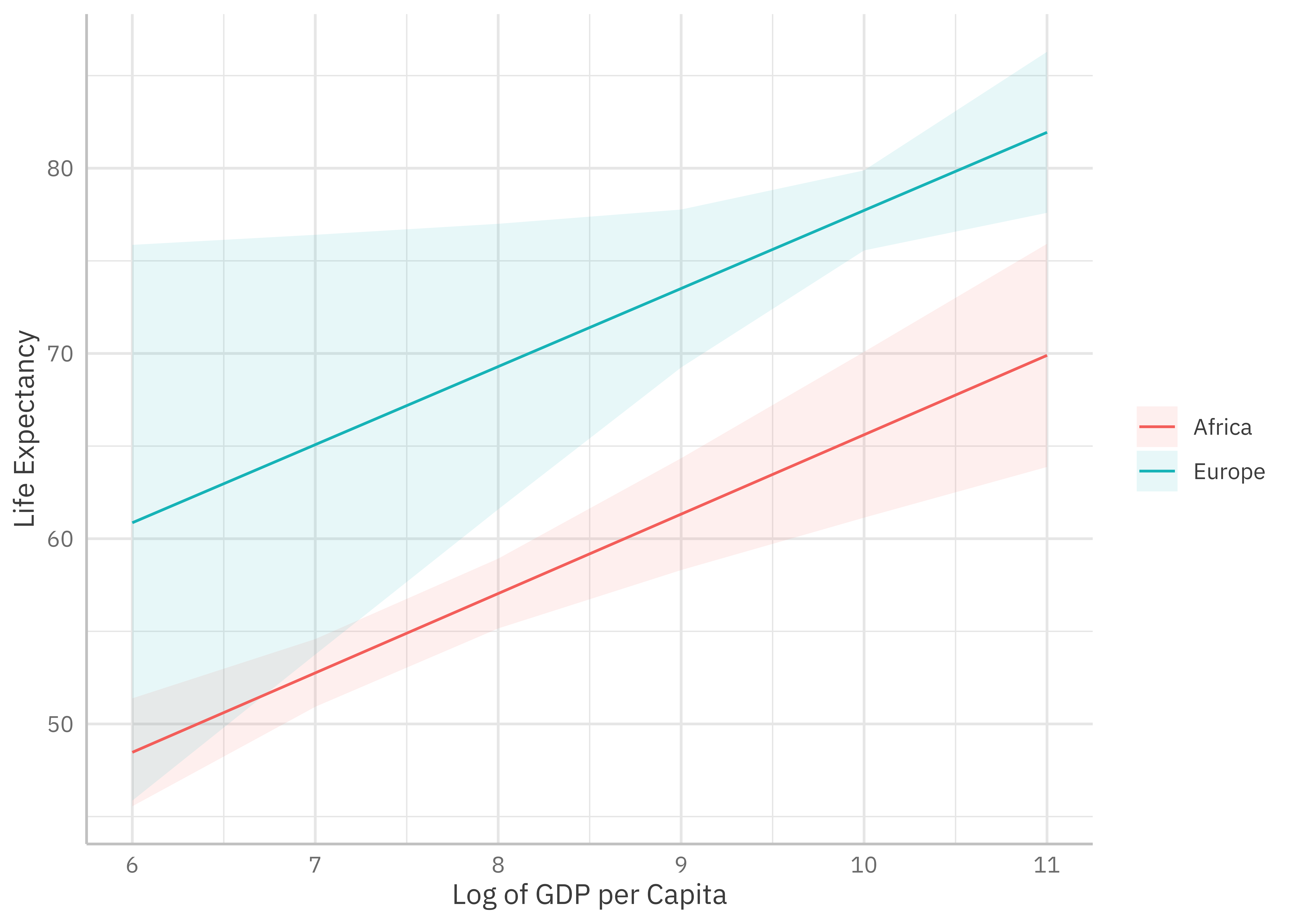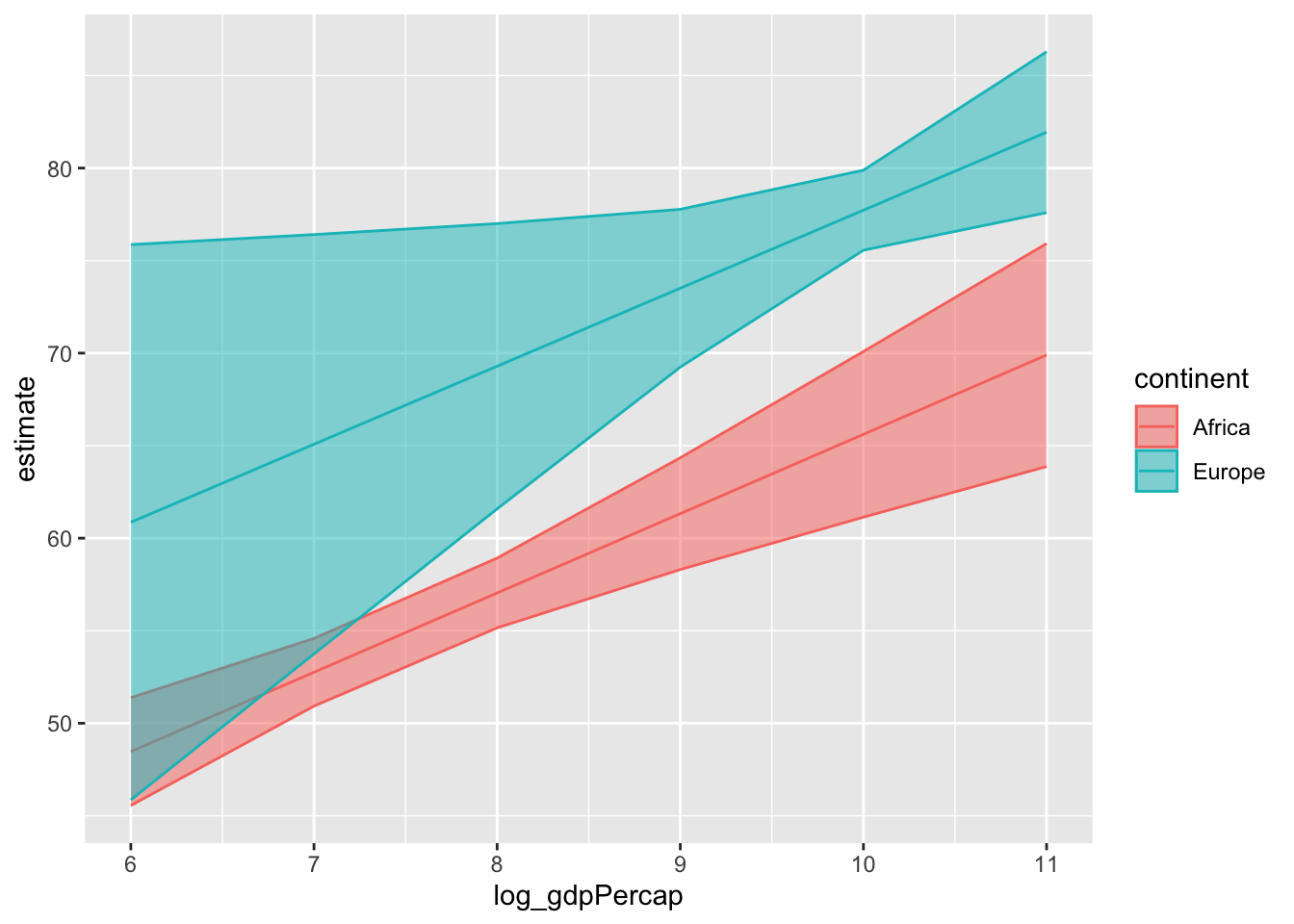 Below, we use plot_comparisons from the marginaleffects package to visualise this latter kind of contrast: i.e., one that allows us to test whether variation in life expectancy across continents is statistically distinguishable at various levels of macro-economic “development.”4 Along the way, we tune other arguments and deploy additional functions to ever-so-slightly modify the base visualisation produced by marginaleffects—but more work can, of course, be done to beautify the graphic.5