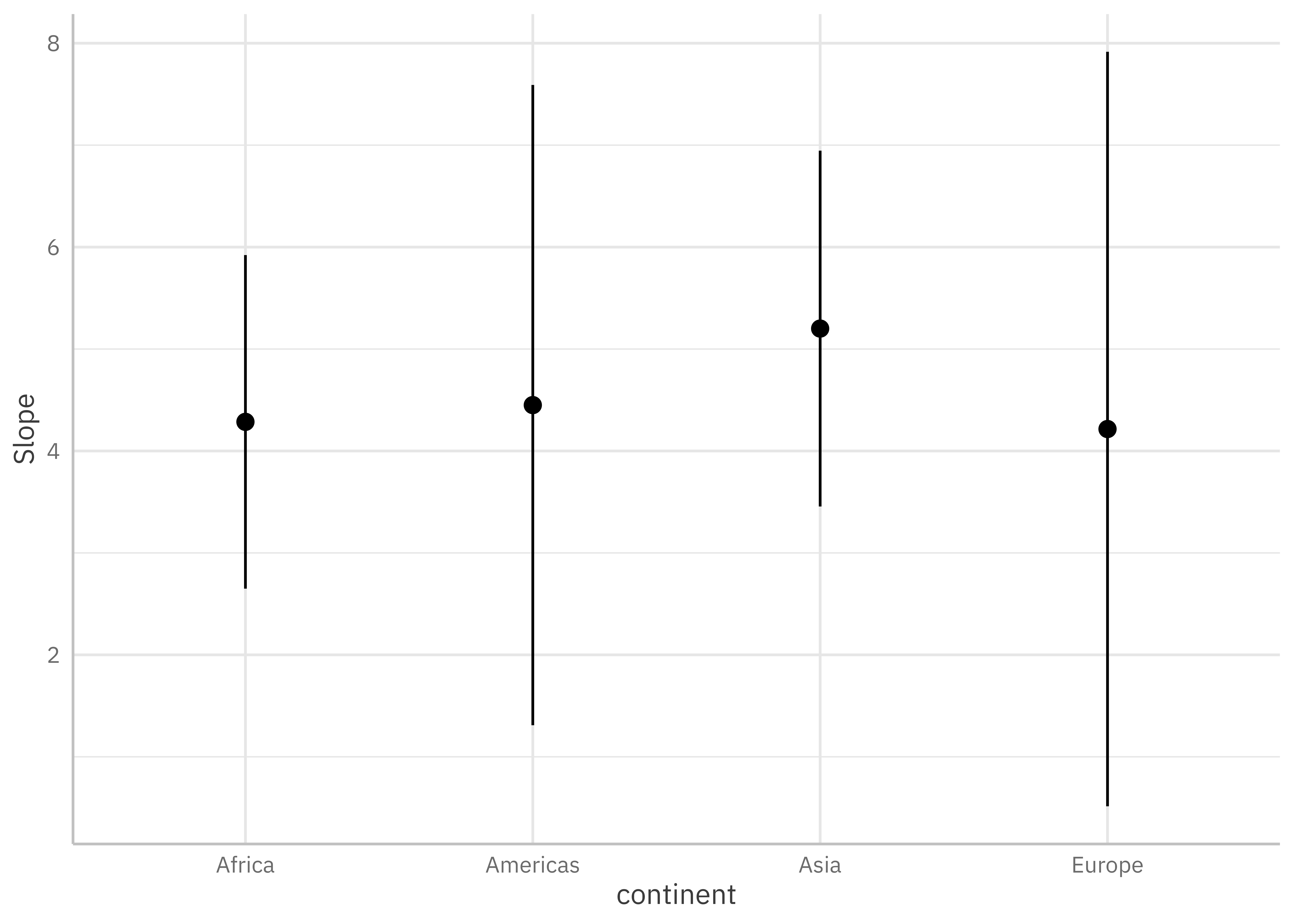Below, we use a few lines of code to estimate and visualise the average marginal effects3 associated with a key regressor (log_gdpPercap) across continents.